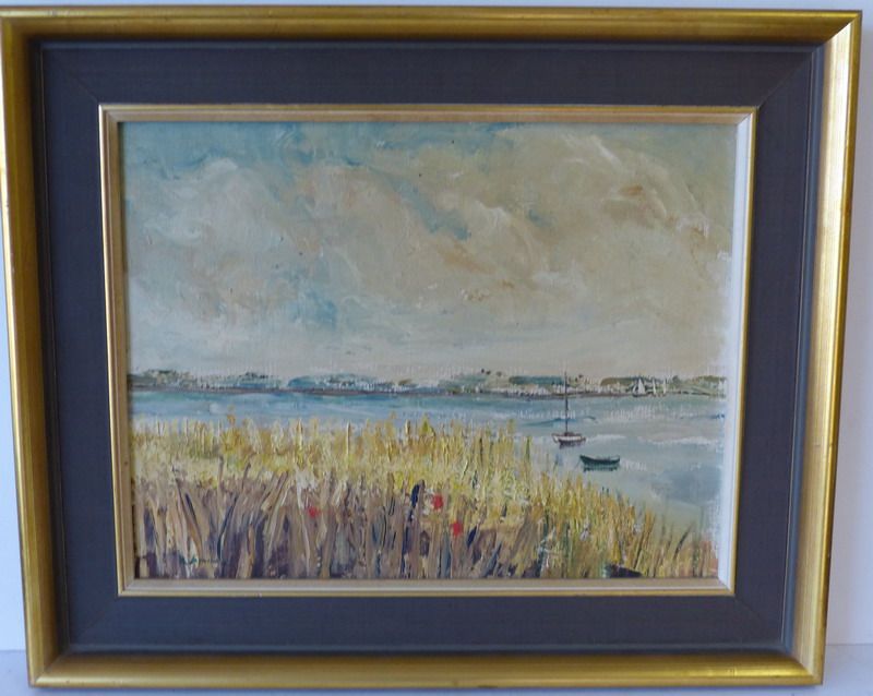 Opposite Canvey` depicting moored sailing boat with land and further boats in distance