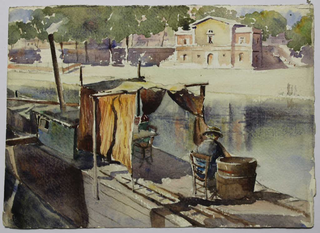 | Femme assise sur le pont de sa péniche, ville en perspective and Grande péniche amarrée, ville en perspective | |
