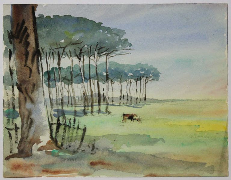 Vache paissant près des pins maritimes
