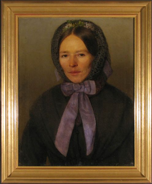 | Portrait einer jungen Bürgersfrau im Pelerinenmantel mit Pelzkragen. Auf dem Kopf trägt sie eine blütengeschmückte Haube mit lil | |
