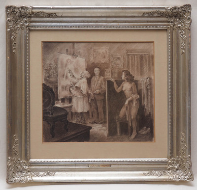 | Atelierszene, im Vordergrund eine unbekleidete junge Frau, sich hinter einem Paravent versteckend, daneben der Maler beim Skizzi | |