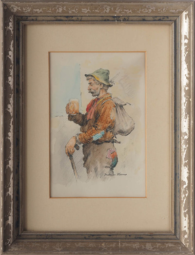 | Dreiviertelsportrait eines Wanderburschen mit Stock, Rucksack und Hut, in der rechten Hand eine Maß Bier haltend | |