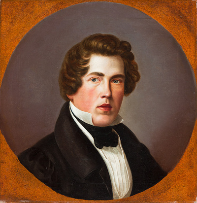 | Young gentleman with dark pages combed in the forehead in a dark coat and white shirt | |