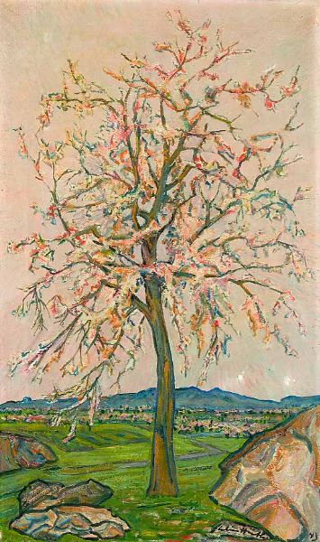 Blühender Baum vor weiter Frühlingslandschaft