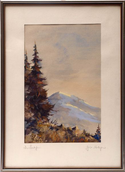 Herbstlicher Blick auf den Belchen, im Vordergrund zwei Tannen an einem Abhang