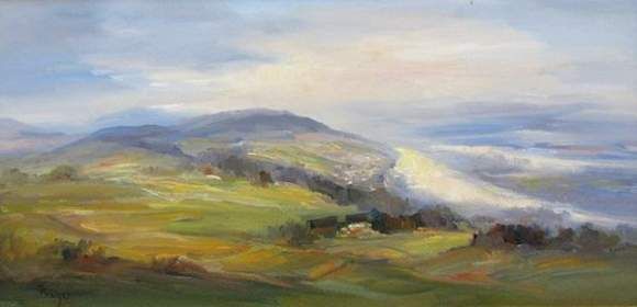 Von einer Anhöhe aus Blick über die weiten, sommerlichen Felder in das RheintaL. U.