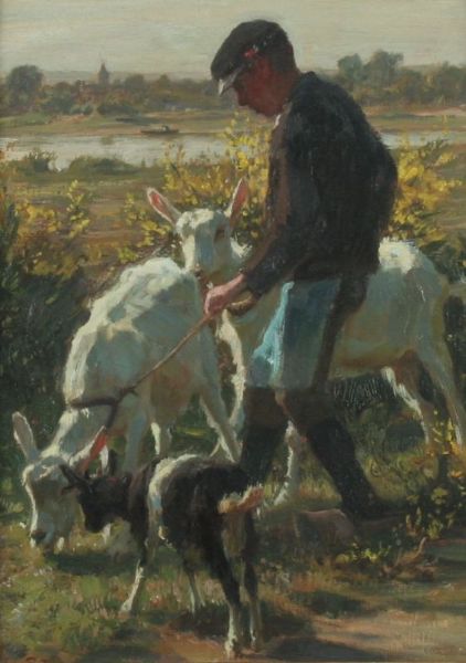 Junger Ziegenhirte mit zwei Ziegen und einem Zicklein