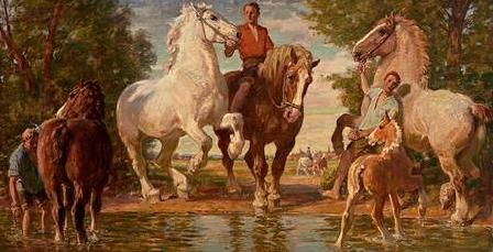 Pferde an der Tränke an einem prachtvollen Sonnentag