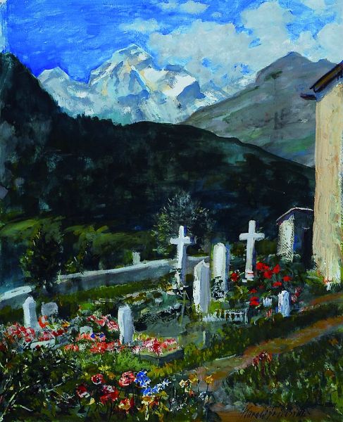 Friedhof mit weißen Grabsteinen und zahlreichen Blumen im Oberengadin, Pont Resina bei St. Moritz