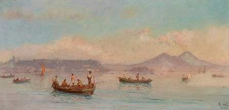 Blick auf die Bucht von Neapel mit zahlreichen Fischerbooten im morgendlichen Licht