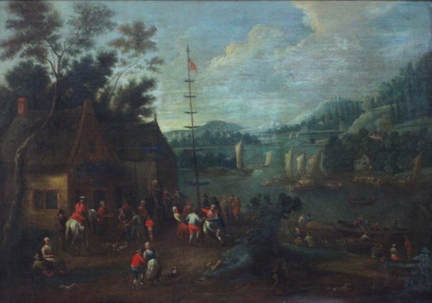 | Figures dancing around a maypole within an Arcadian landscape | |