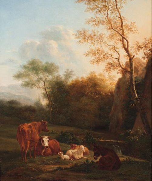 Landschaft mit Esel, Kühen und Schafen