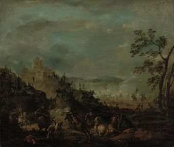 | A cavalry skirmish with a fortified town beyond | |
