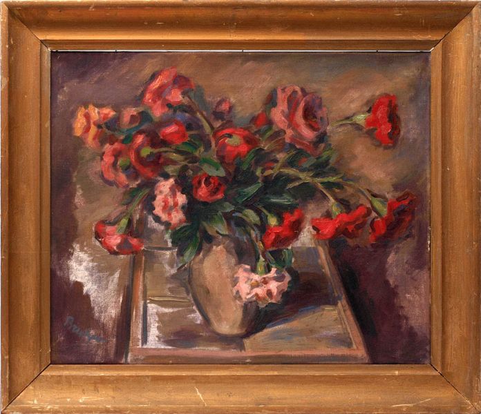 Voll erblühter Gartenblumenstrauß in brauner Tonvase vor changierendem Hintergrund