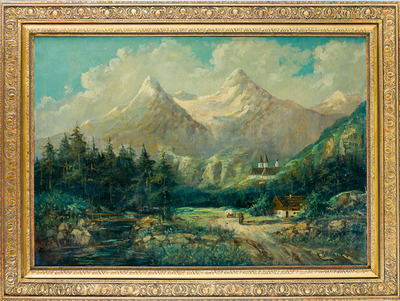 Upper Bavarian mountain valley with monastery and mountain peaks with firn snow