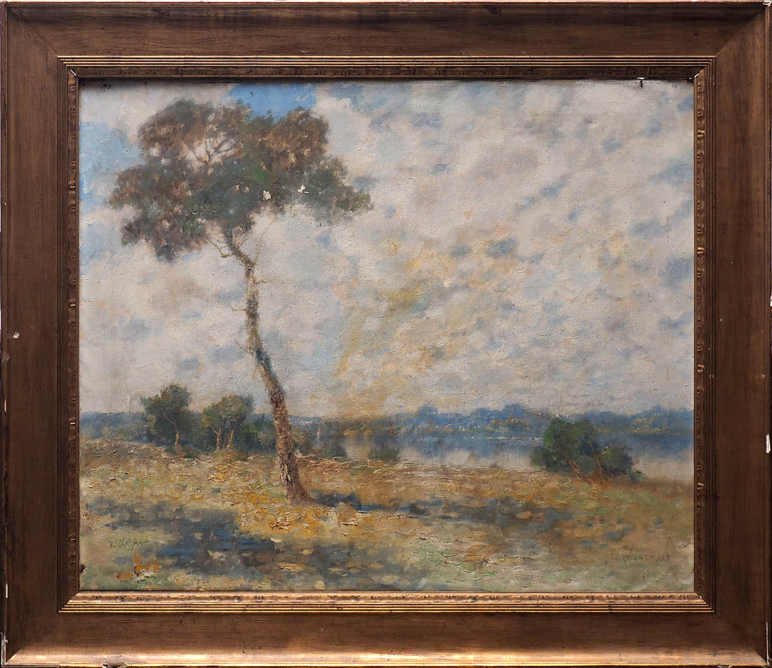 | Die Flussinsel Pichelswerder im Frühling. Im Vordergrund einsamer Baum mit Blick auf den Zulauf der Havel in den Stößensee unter | |