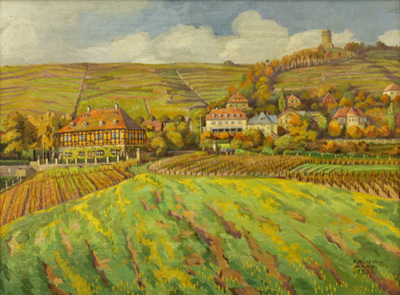 View of Radebeul vineyards with Weingut Hoflößnitz in autumn.