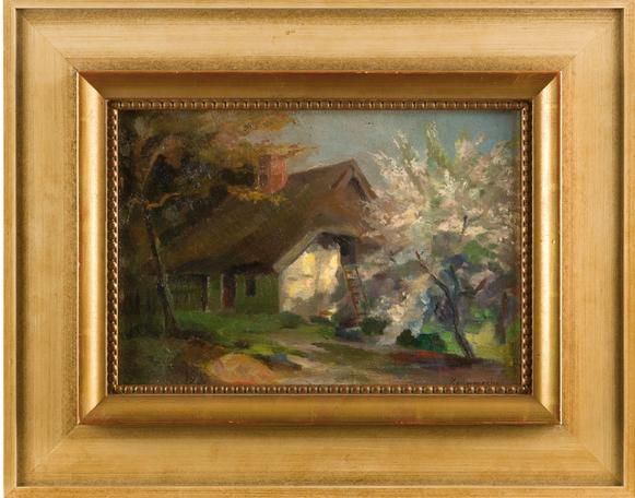 Bauerngehöft im Frühling. Vor dem Haus ein blühender Obstbaum