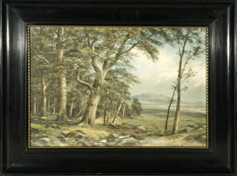 | Morgenstimmung in weiter Flusslandschaft. Im Vordergrund tritt ein Rehbock sichernd aus dem Eichenhain | |