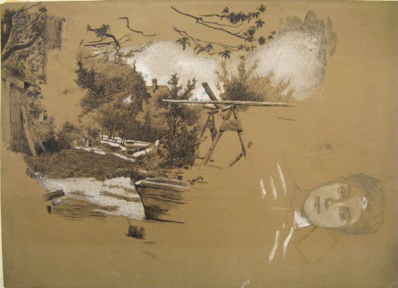 Skizzenblatt mit Landschaft, Damenportrait und Männerakt