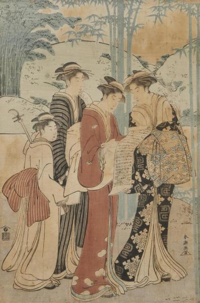 | Oban tate-e, trois geisha lisant un rouleau, accompagnées d'un kamuro portant un shamisen. | |