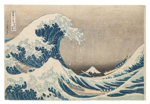 An oban yoko-e print entitled Kanagawa-oki nami-ura (Under the Wave off Kanagawa), from the series Fugaku sanjurokkei (36 Views of Mount Fuji) | |