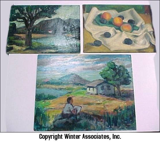 an impressionistic landscape of an artist sketching trees, cabin and mountains