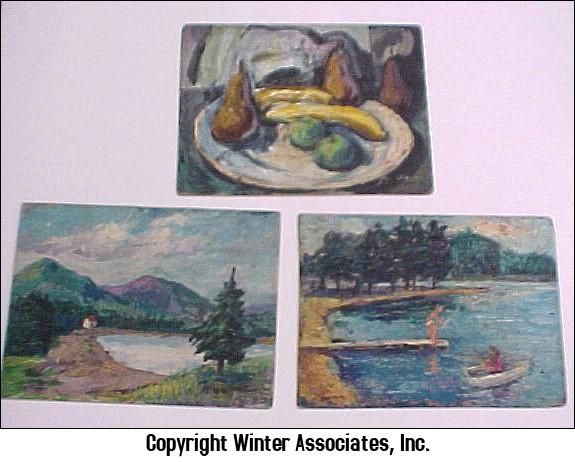 | two are impressionist landscapes including a lake and mountain scene, and a lake shore scene with a dock and a person in a boat | |