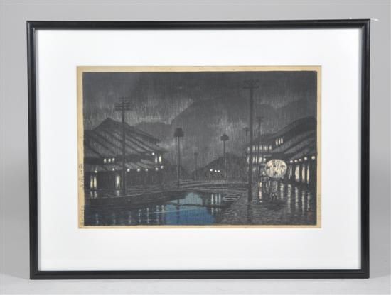 Street scene in heavy rain at night. Shirozaki, Tajima