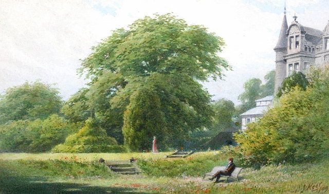 A figure seated on a bench in the grounds of a chateau
