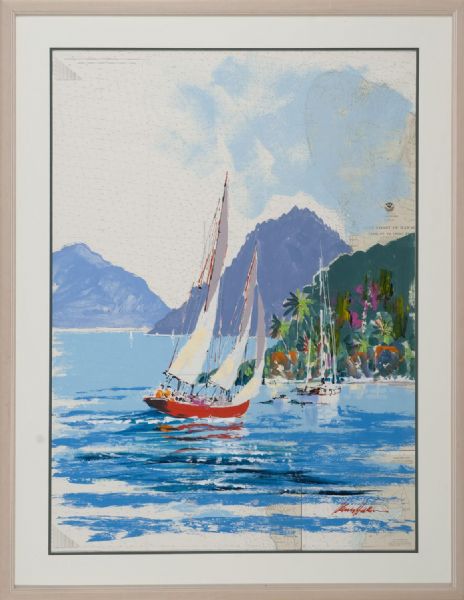 Hawaiian harbor scene painted on an old coastal chart of Hawaii