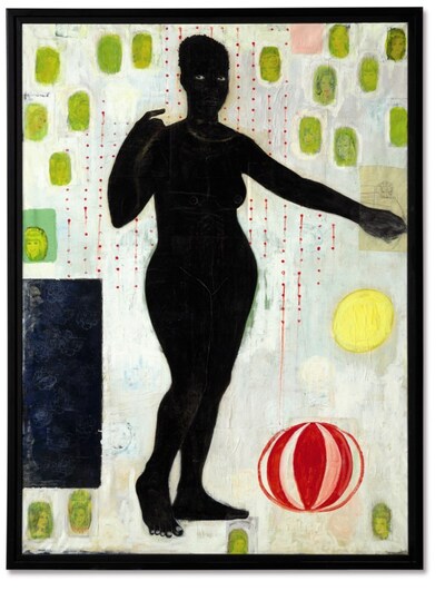 | Acrylic graphite, crayon, paper collage and printed paper collage on canvas | |
