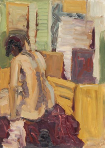 Weiblicher Rückenakt, nach rechts zum Fenster blickend