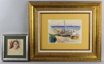 PORTRAIT OF A WOMAN and SAILBOAT ON SHORE