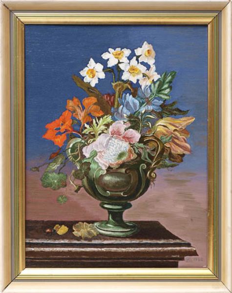 Prächtiges Blumengesteck im Stil des 16.Jhdts. in einer Steinvase auf einer Balustrade