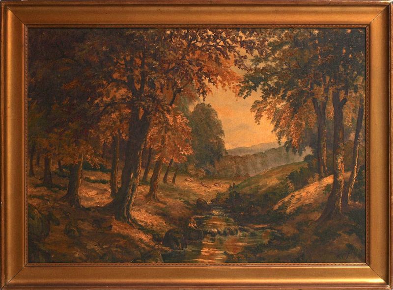Herbstliche Waldlandschaft, im Vordergrund ein Bach im Licht der untergehenden Sonne