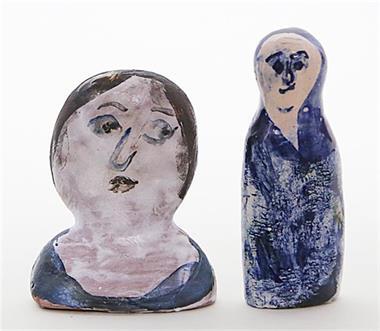 Zwei Figuren. Ton, farbig bemalt (Glasurfehlstelle bzw. -fehler)