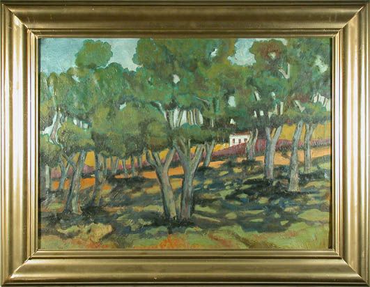 Pinienhain, im Hintergrund ein kleines Bauernhaus