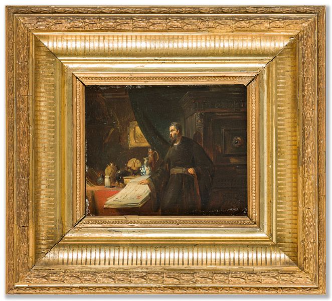 Gelehrter in Studierstube vor aufgeschlagenem Foliant