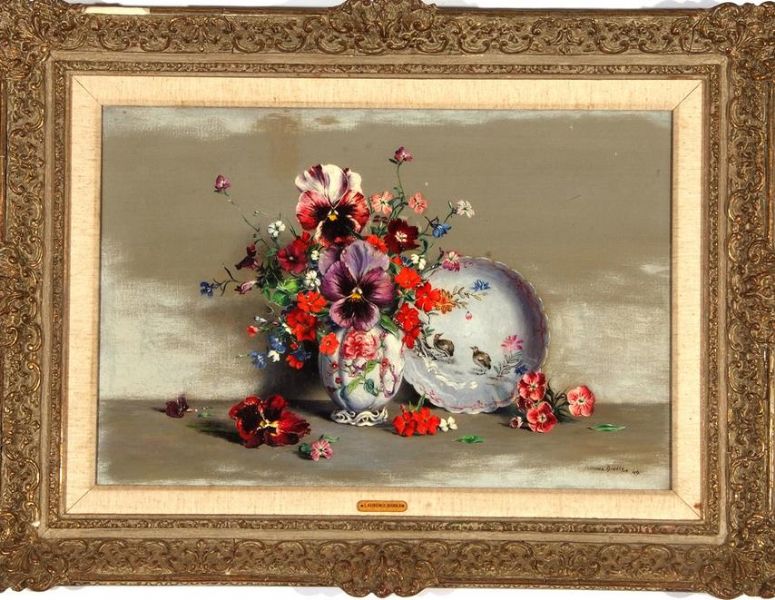 | Still life study of summer flowers in a Chinese vase with plate on a ledge | |