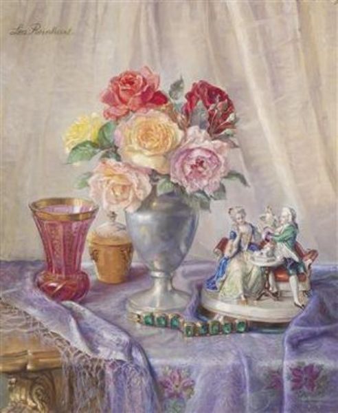 Still life with a bouquet of roses and figurines on a piece of cloth