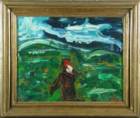 Abstrahierende Landschaft, im Vordergrund eine Figur