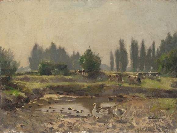 Landschaft mit Kühen und Gänsen