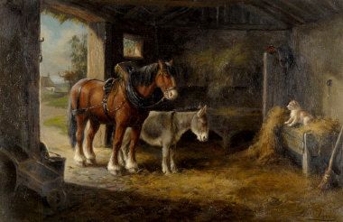 a stable interior, with a donkey, shire horse and dog