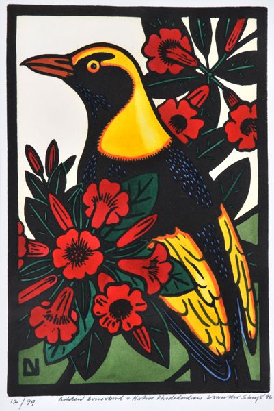Golden Bowerbird and Nature Rhododendron