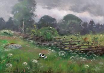 Landskap med gärdesgård och skator