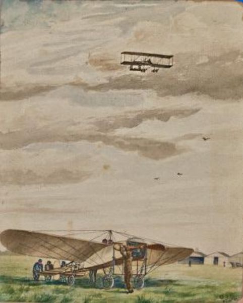 Interest. A Rare Original Watercolour of a Bleriot Aircraft being prepared for take off