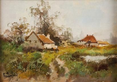 Promeneuses au chemin - Chaumières à l'étang