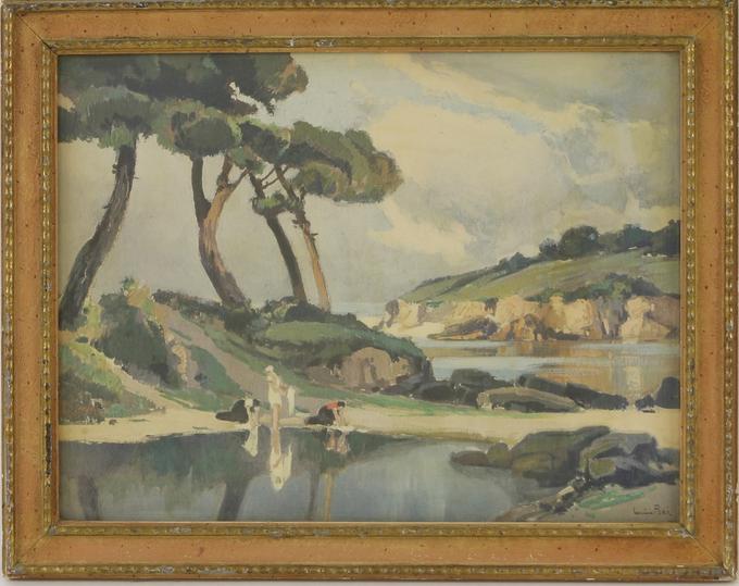 WOMEN WASHING BESIDE A SEA INLET, TREES BEHIND