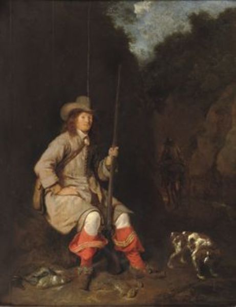 A huntsman and his hound in a wooded landscape